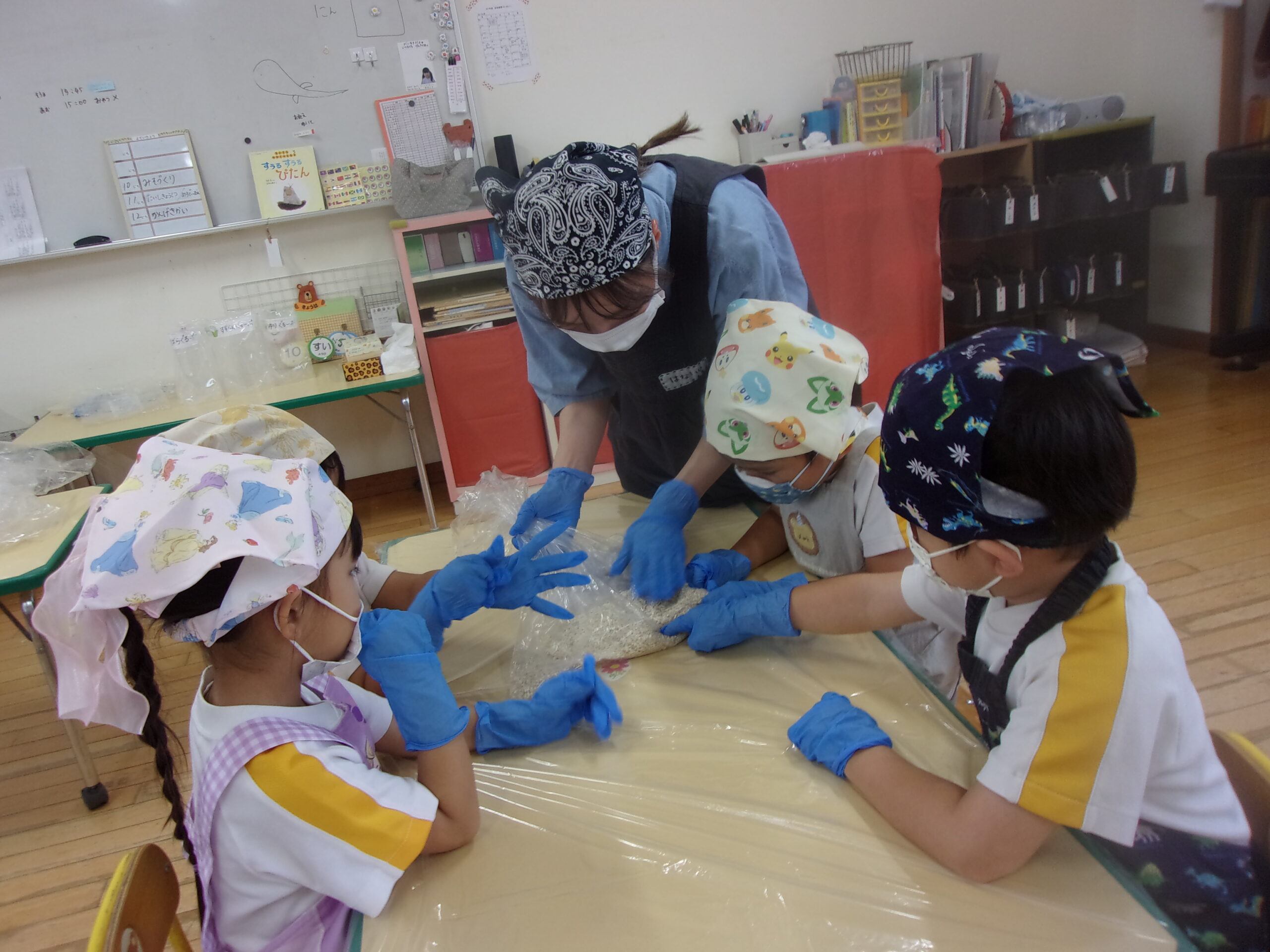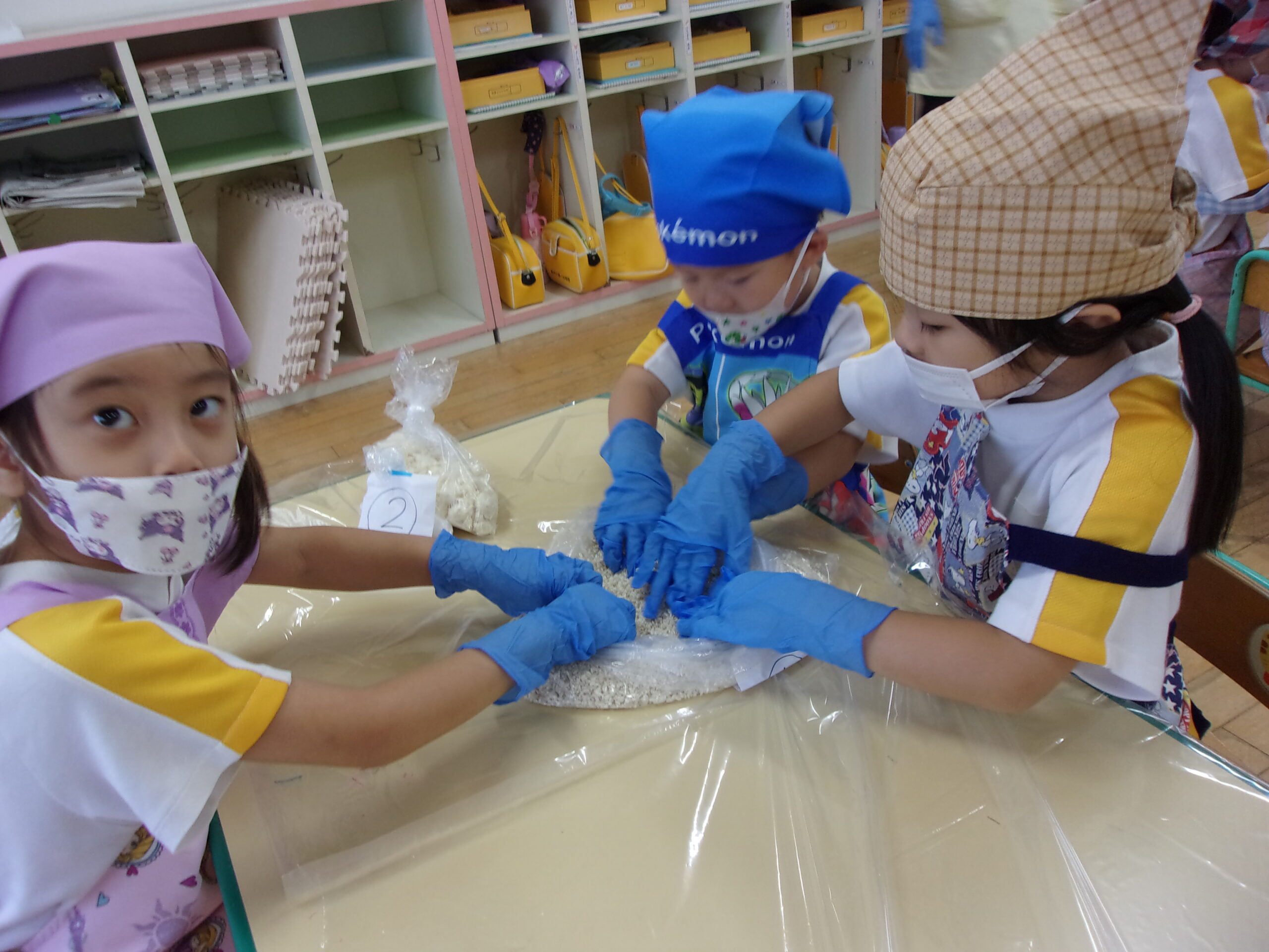 9月10日に年中組で、みそ作りを行いました!今回の材料は米麴(生)・塩・おから・豆乳(無調整)です。材料を順番に入れながら揉みほぐしていきます。