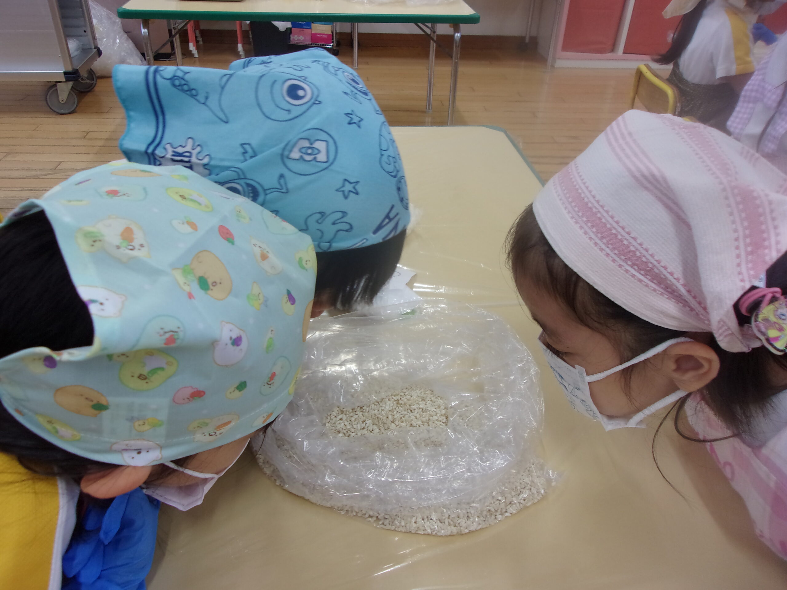 米麴の匂いを嗅いだ子どもたちは、揉みほぐしながら「パンの匂いがする」、「ポテトチップスの匂い!」、「チーズの匂い」などたくさん聞こえてきました!