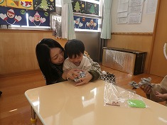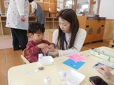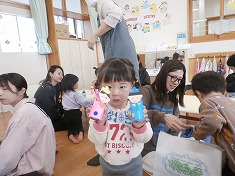 シールを貼ったり、体になるボトルに大豆やビーズを