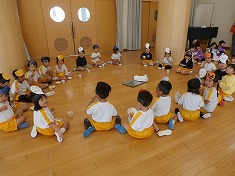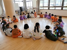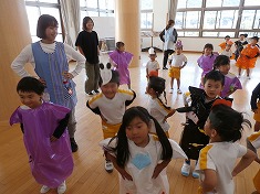 5歳児が、3、4歳児に優しく声を掛けたり一緒に踊りを踊ったりして